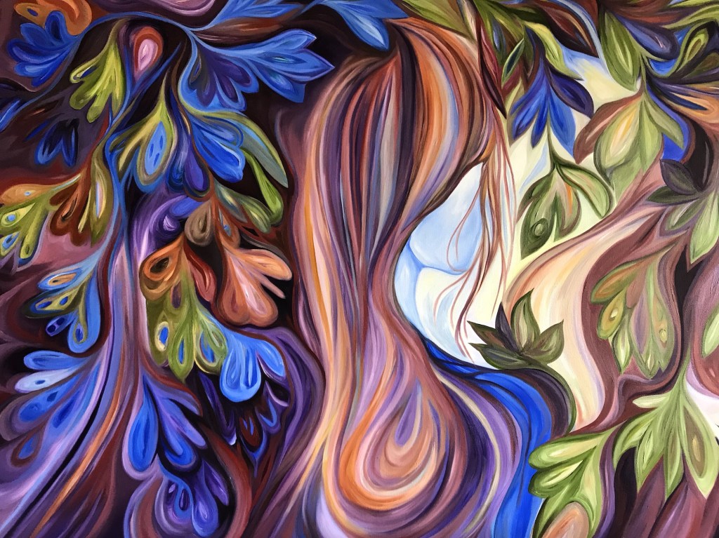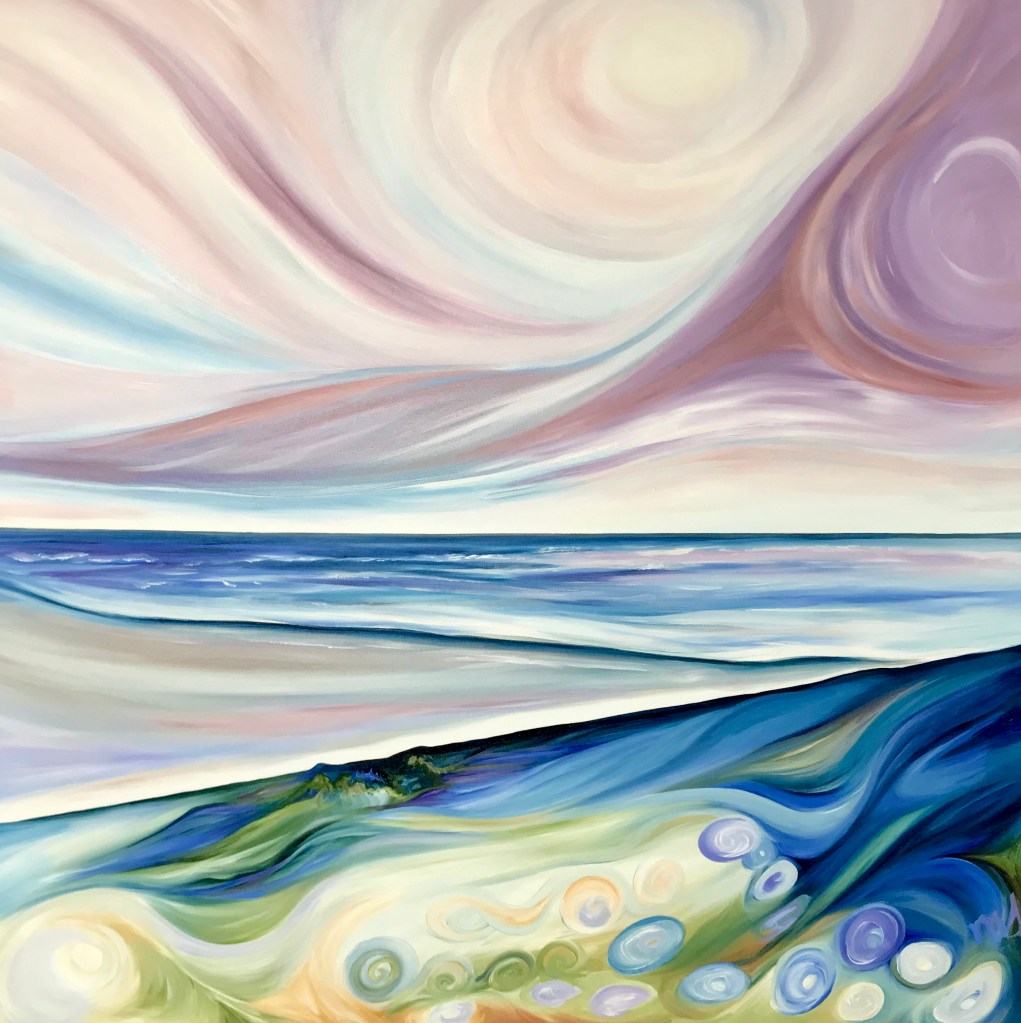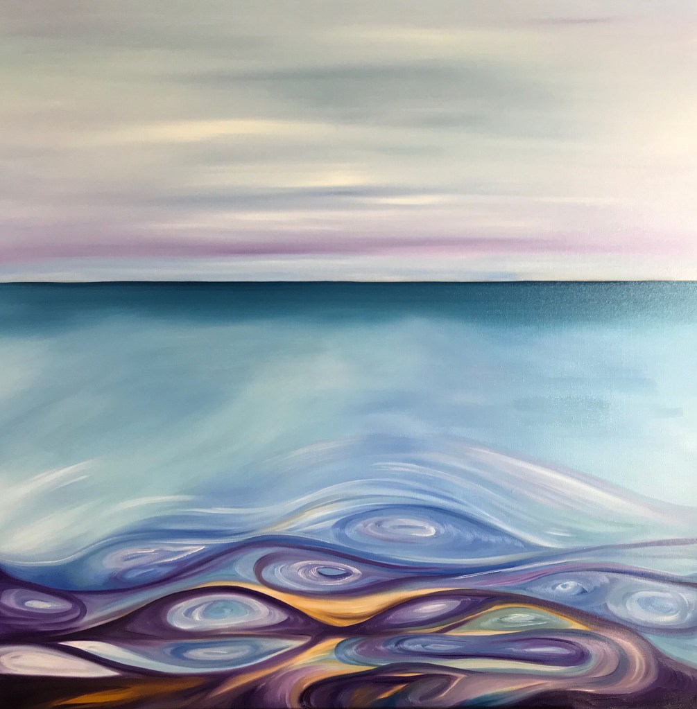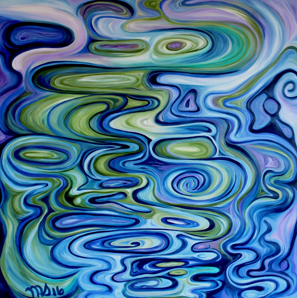 I usually focus on painting themes in sets, clusters and groupings inspired by special moments and places. One of my special areas of focus is water and shore abstracts. Trees, mountains and other landscapes also play a large part in my abstract themes. And … I love to place women abstractly into the natural environment too.